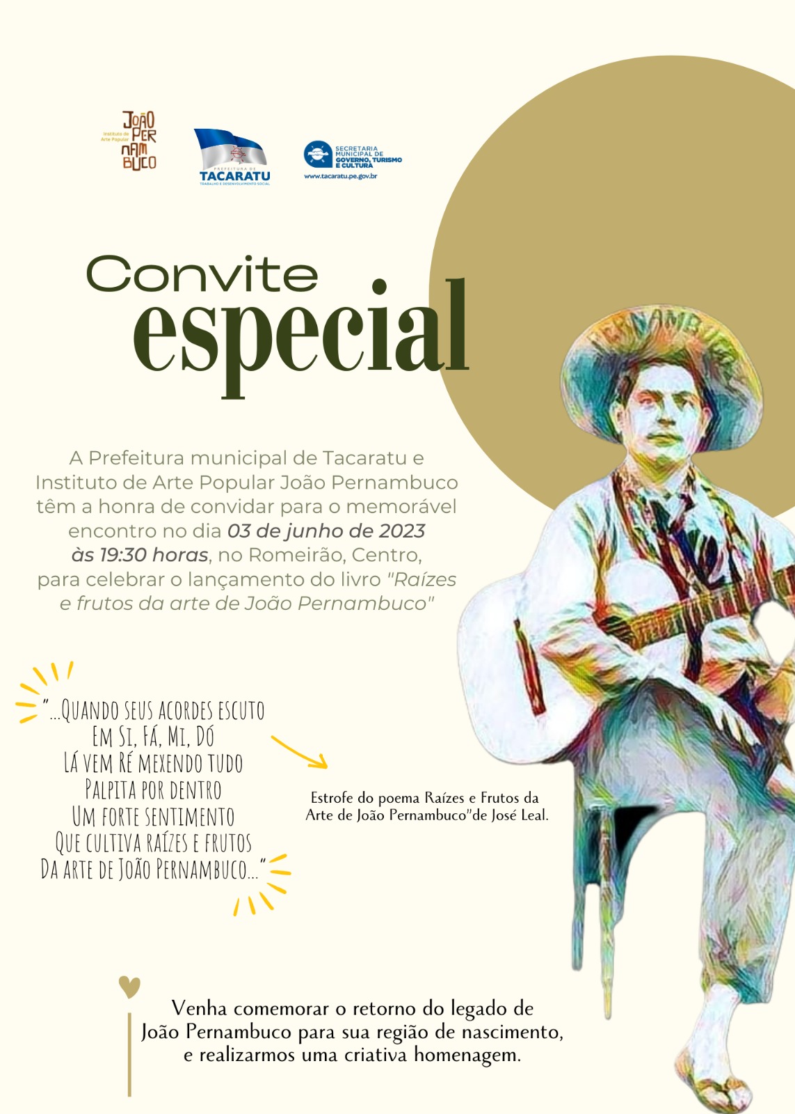 Convidamos toda a população de Tacaratu, para o lançamento do Livro: Raízes e frutos de João Pernambuco. Esperamos todos vocês para esse encontro memorável. neste sábado, 03 de Junho de 2023, a partir das 19:30 no Romeirão.